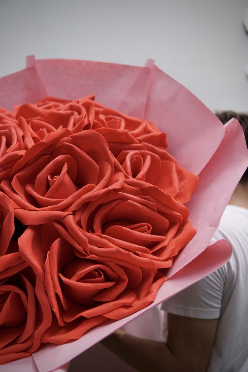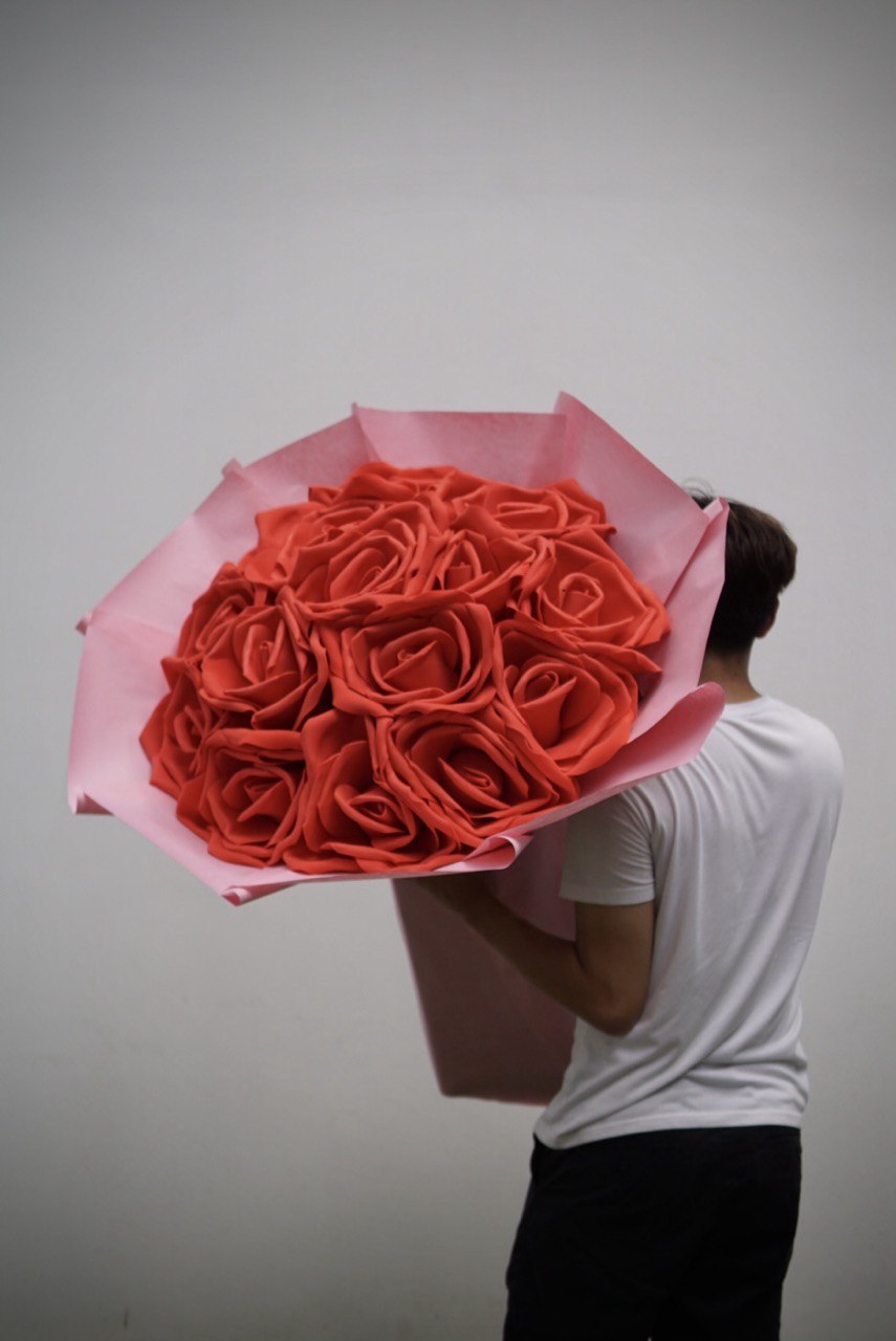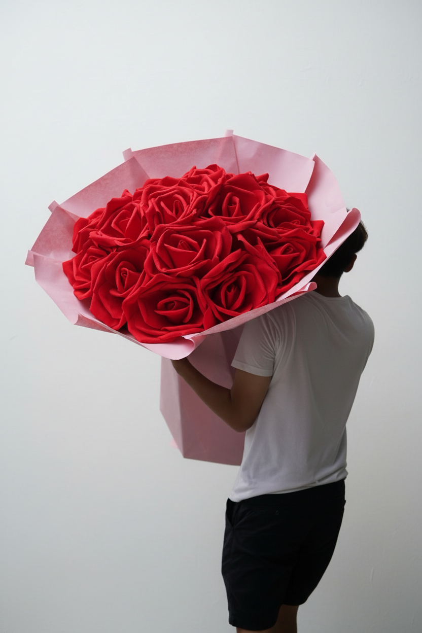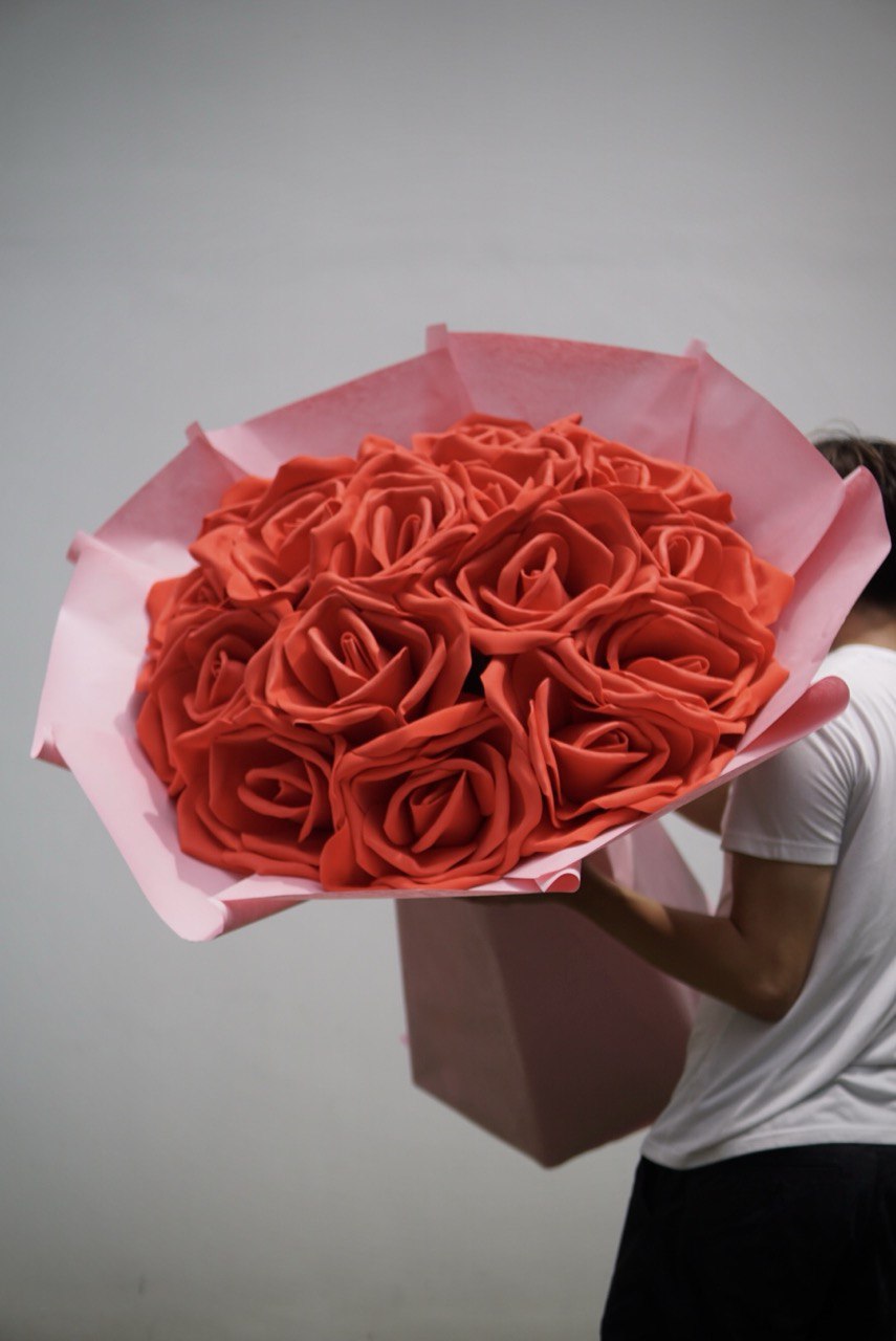 Our giant roses and bow are made from European sourced PE foam, with premium paper wrapping and sturdy cardboard backing, ensuring a lightweight yet durable bouquet.